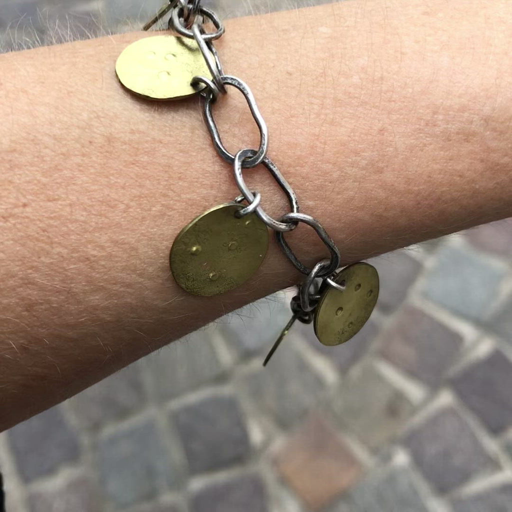 Jane aims for her work to show traces of process, irregular shapes, hammer marks, naturally patined brass and rubbed back painted surfaces. It is the acceptance of the imperfections in her work that she considers a subtle rebellion against the more polished mainstream, that she considers its strength and uniqueness.