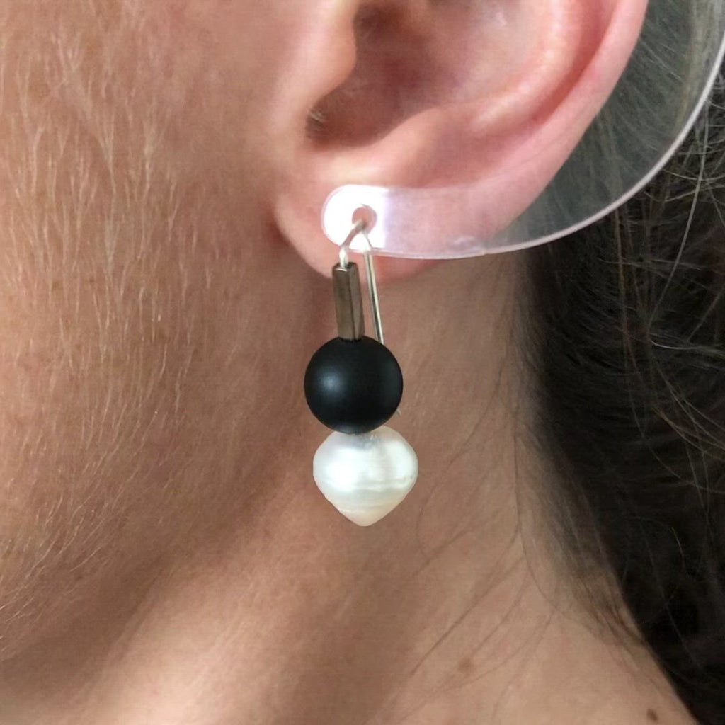 These earrings are freshwater pearl 12mm, onyx matt 10mm, sterling silver hoops, copper coated hematite.